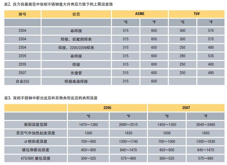 The temperature limits of various duplex stainless steels specified in the pressure vessel design specifications are shown in Table 2.