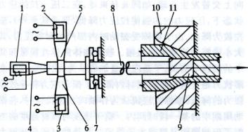 1, 2, 3-transducer; 4, 5, 6-concentrator; 7-pressure bearing 8-tie rod; 9-mandrel; 10-outer mold; 11-tube material